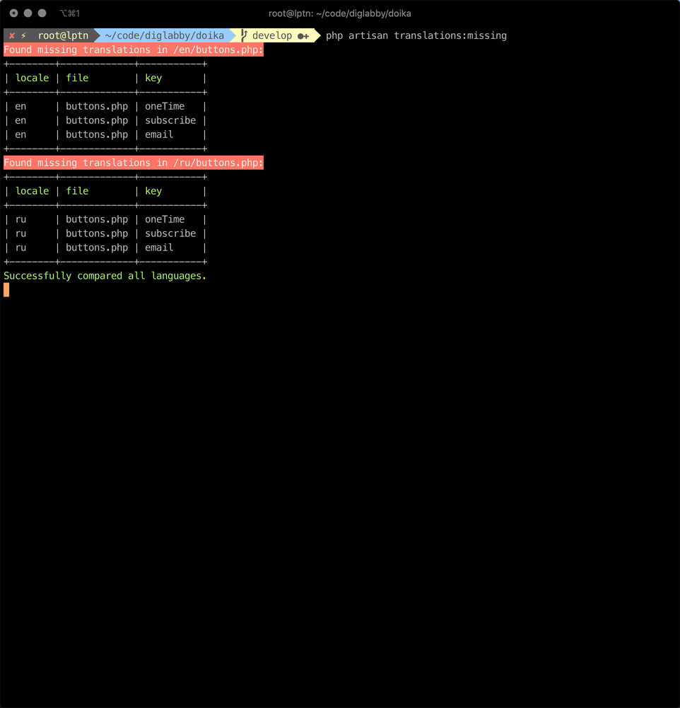 Artisan command to find missing translations. It takes a basic locale and finds missing keys/translations in other locales.