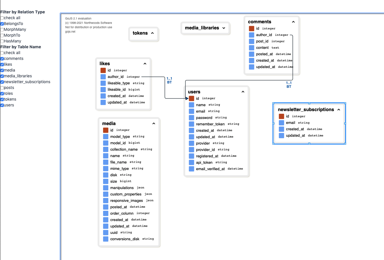 { "link_data": [ { "from": "comments", "to": "users", "fromText": "1..1\nBT", "toText": "", "fromPort": "author_id", "toPort": "id", "type": "BelongsTo" }, { "from": "comments", "to": "posts", "fromText": "1..1\nBT", "toText": "", "fromPort": "post_id", "toPort": "id", "type": "BelongsTo" }, ... ... ], "node_data": [ { "key": "comments", "schema": [ { "name": "id", "isKey": true, "figure": "Hexagon", "color": "#be4b15", "info": "integer" }, { "name": "author_id", "isKey": false, "figure": "Decision", "color": "#6ea5f8", "info": "integer" }, ... ... } ... ]