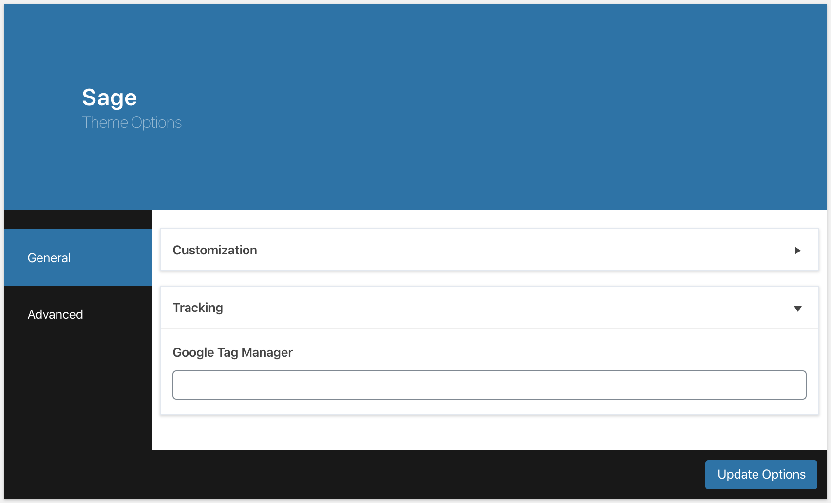 use StoutLogic\AcfBuilder\FieldsBuilder; acf_add_options_page([ 'page_title' => get_bloginfo('name'), 'menu_title' => 'Theme Options', 'menu_slug' => 'theme-options', 'update_button' => 'Update Options', 'capability' => 'edit_theme_options', 'position' => '999', 'autoload' => true, ]); $options = new FieldsBuilder('theme_options', [ 'style' => 'seamless', ]); $options ->setLocation('options_page', '==', 'theme-options'); $options ->addTab('general') ->setConfig('placement', 'left') ->addAccordion('customization') ->addImage('logo') ->addAccordion('tracking') ->addText('gtm') ->setConfig('label', 'Google Tag Manager') ->addAccordion('tracking_end')->endpoint() ->addTab('advanced') ->setConfig('placement', 'left') ->addTrueFalse('debug') ->setConfig('ui', '1'); acf_add_local_field_group($options->build());