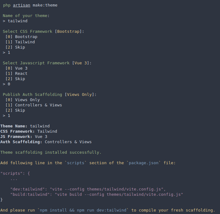 This command will ask you to enter theme name, CSS framework, js framework, and optional auth scaffolding.