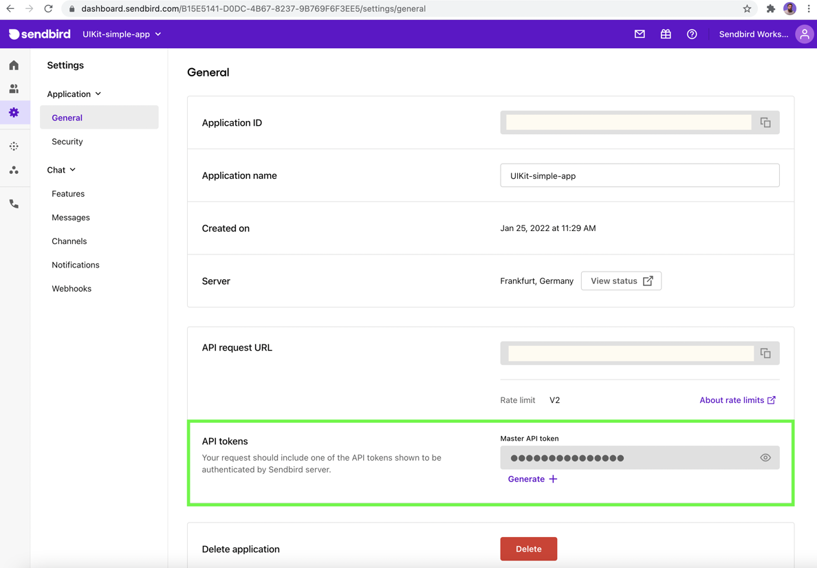 In order to make requests with this SDK you will need you master API token. This can be found through the Sendbird dashboard. Each app you create in Sendbird has its own master api token. These tokens can be found in Settings > Application > General.
