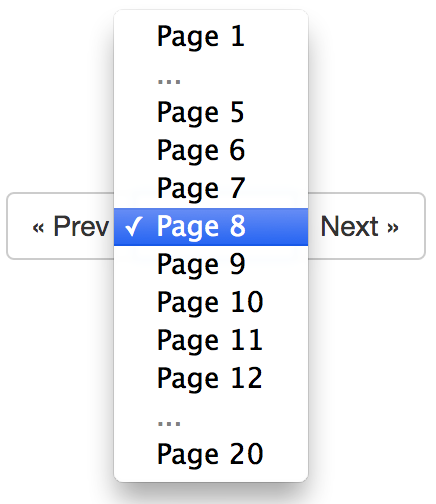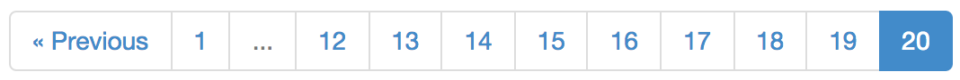 These examples show how the paginator handles overflow when there are a lot of pages. They're rendered using the sample templates provided in the examples directory, which depend on Twitter Bootstrap. You can easily use your own custom HTML to render the pagination control instead.